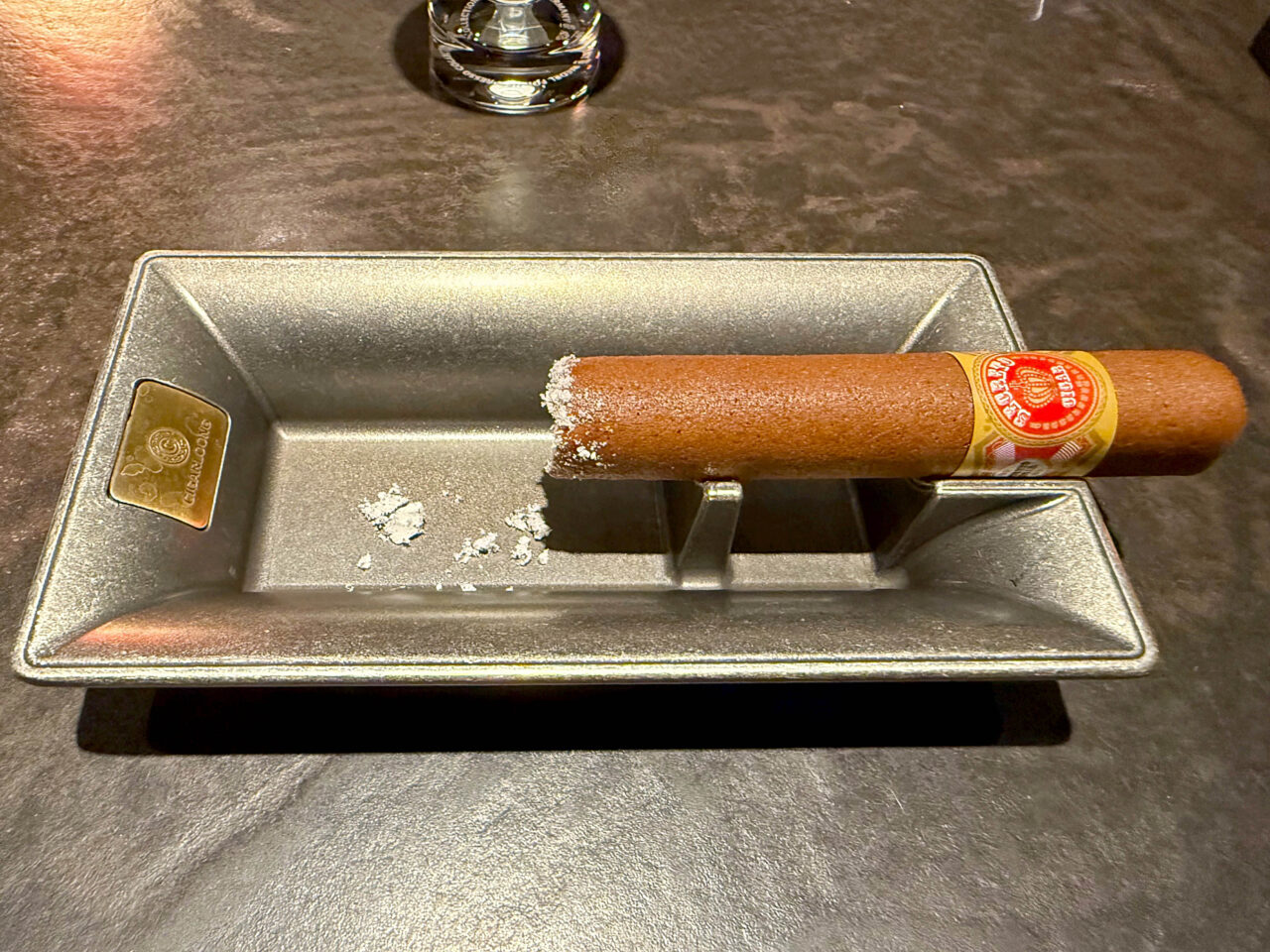 クリームの詰まったシガーロールがホンモノの葉巻のシングルスロットの灰皿に乗っています。