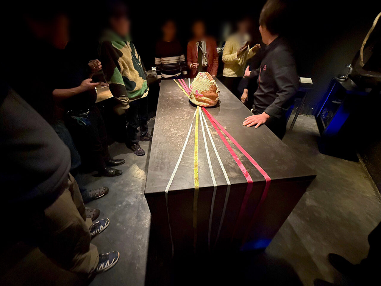 宴の後、奥のスクリーンには「ARIGATO!!」の文字が浮いています。