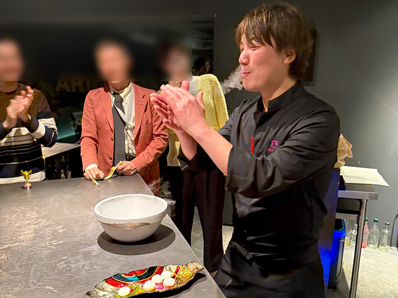 スモークとレーザー光線の中から薮中章禎オーナーシェフが登場。