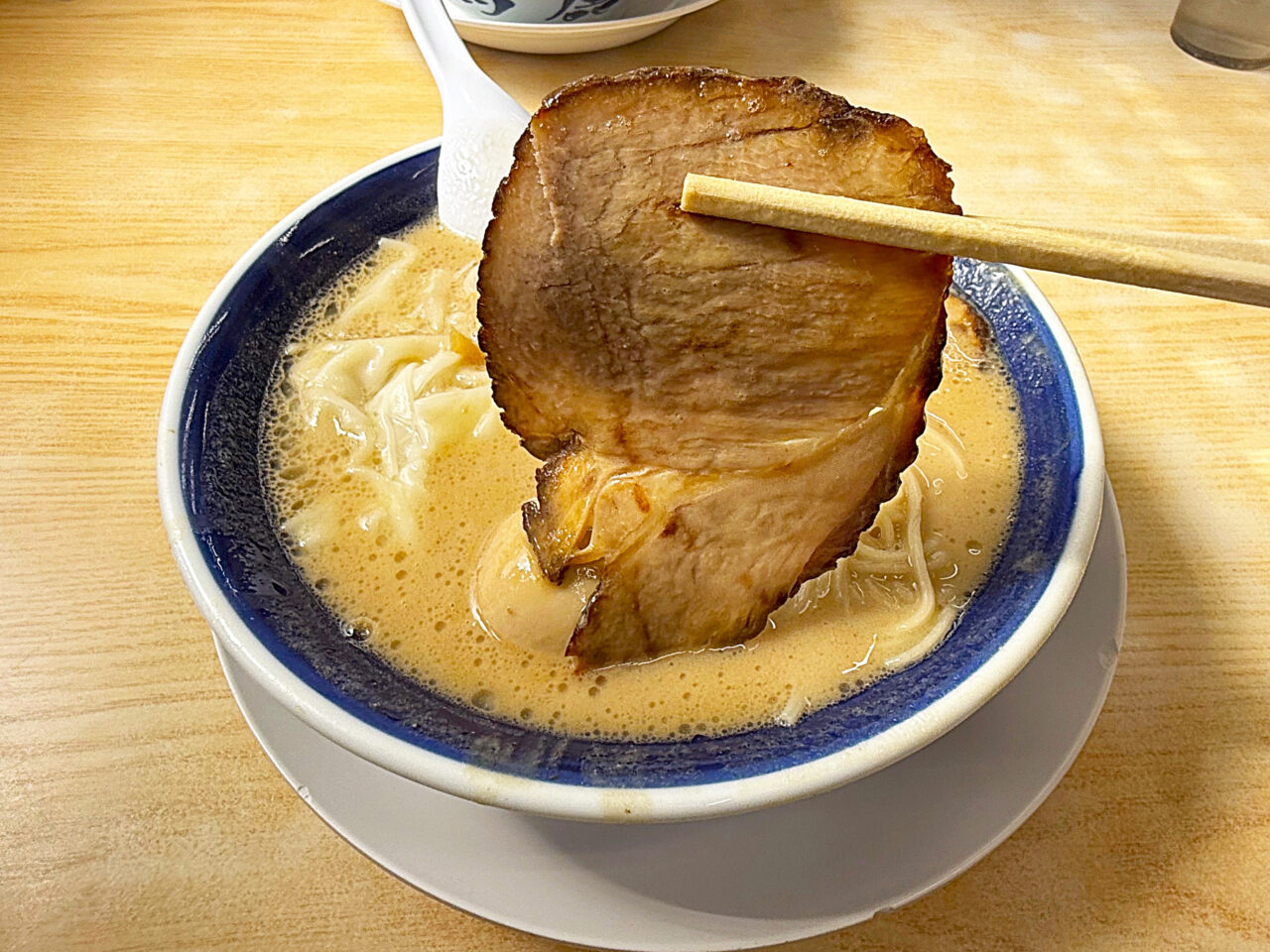 博多ラーメンとしては珍しい厚手のチャーシューですが、柔らかいので麺と食べる事が出来ます。