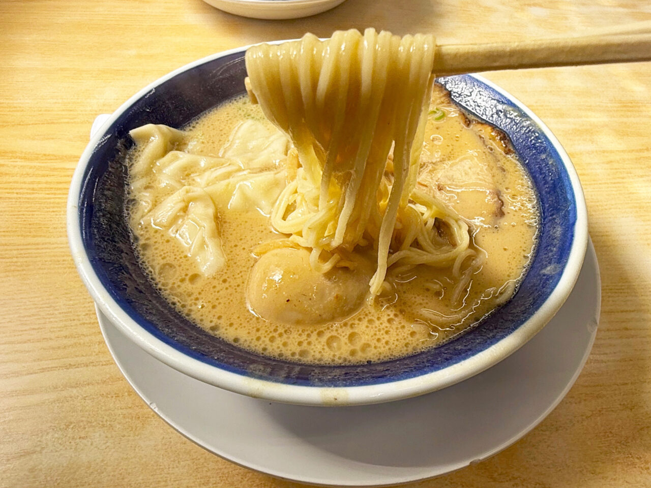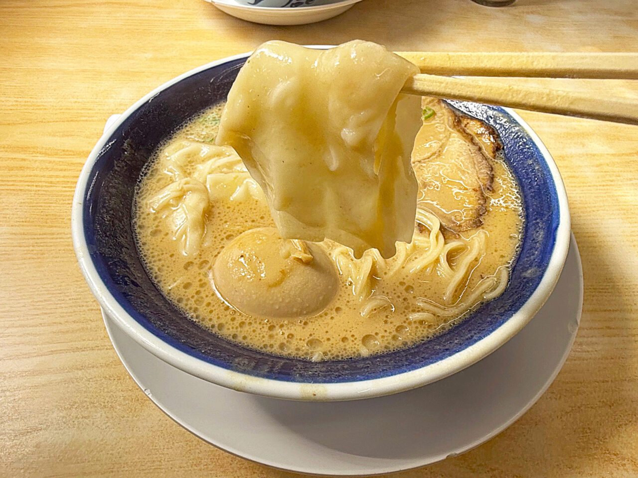 豚骨スープにワンタンと言う組み合わせは、「博多ラーメン しばらく 日本橋店」さんでも有りましたが、豚骨スープにはフワフワの皮と、少量の餡が良く合います。