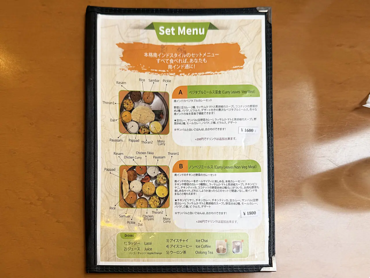 セットメニューはA〜Lまでと幅広く、悩みましたがBの「Curry Leaves Non Veg Meal」にしました。