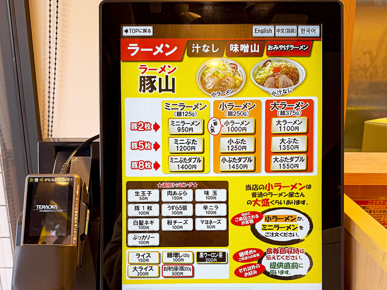 メニュー構成も良く考えられており、ラーメン、トッピング、サイドメニューが1画面に集約されています。