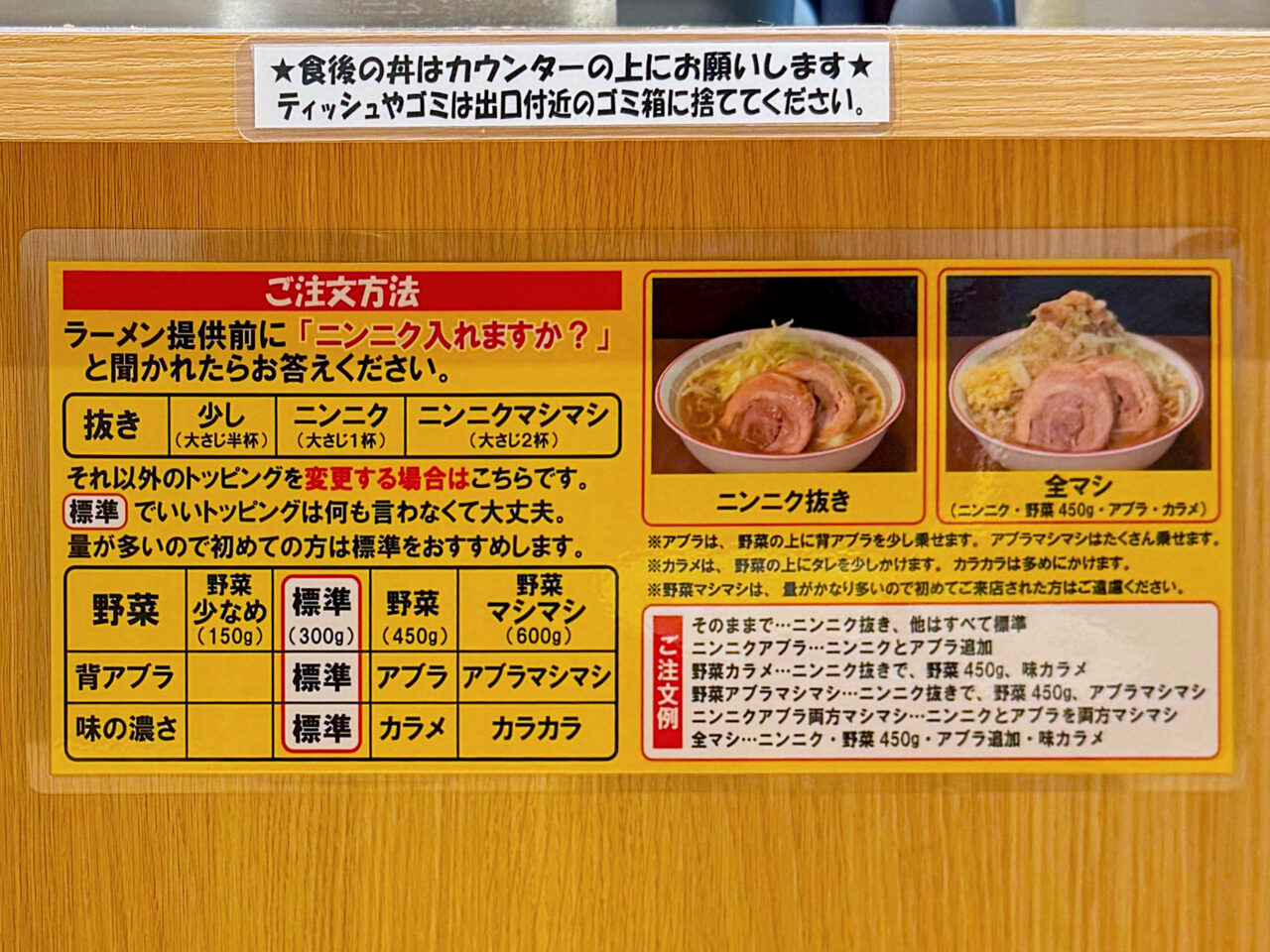 二郎系特有の「コール」についてもカウンターに貼ってあって、分かり易い様になっています。