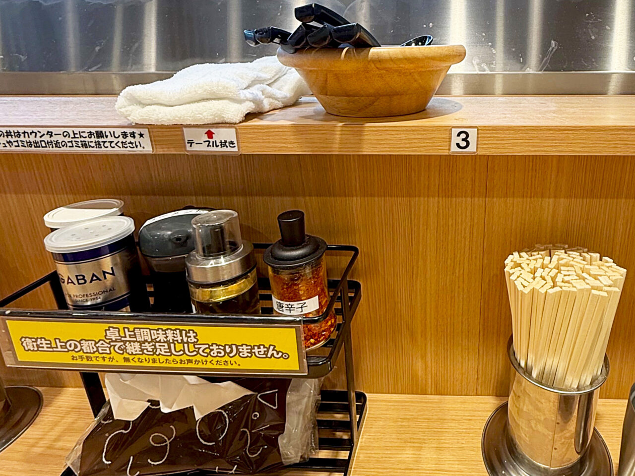 卓上調味料、箸、レンゲ、ダスター、ティッシュなどが機能的に配置されたカウンター。
