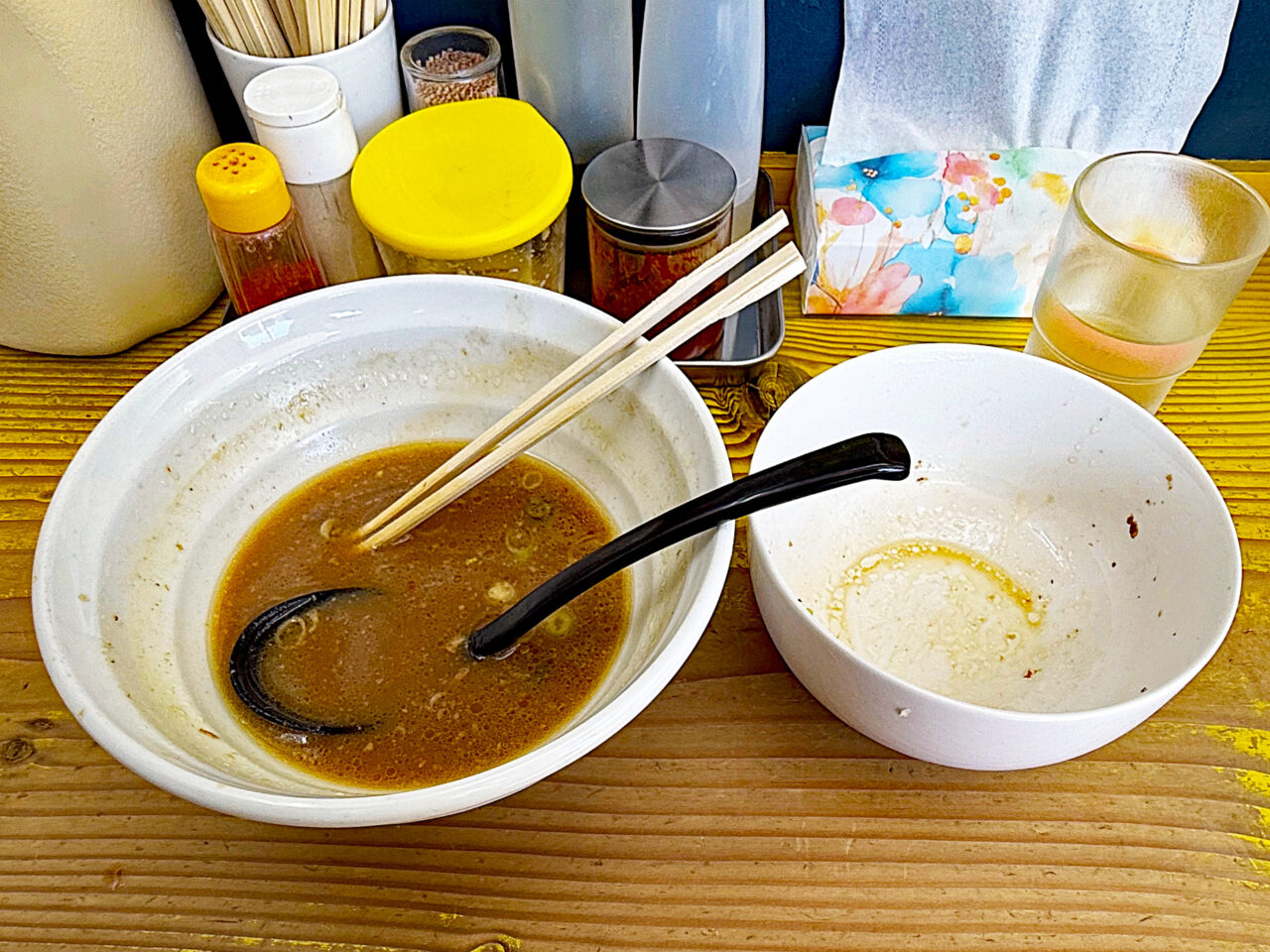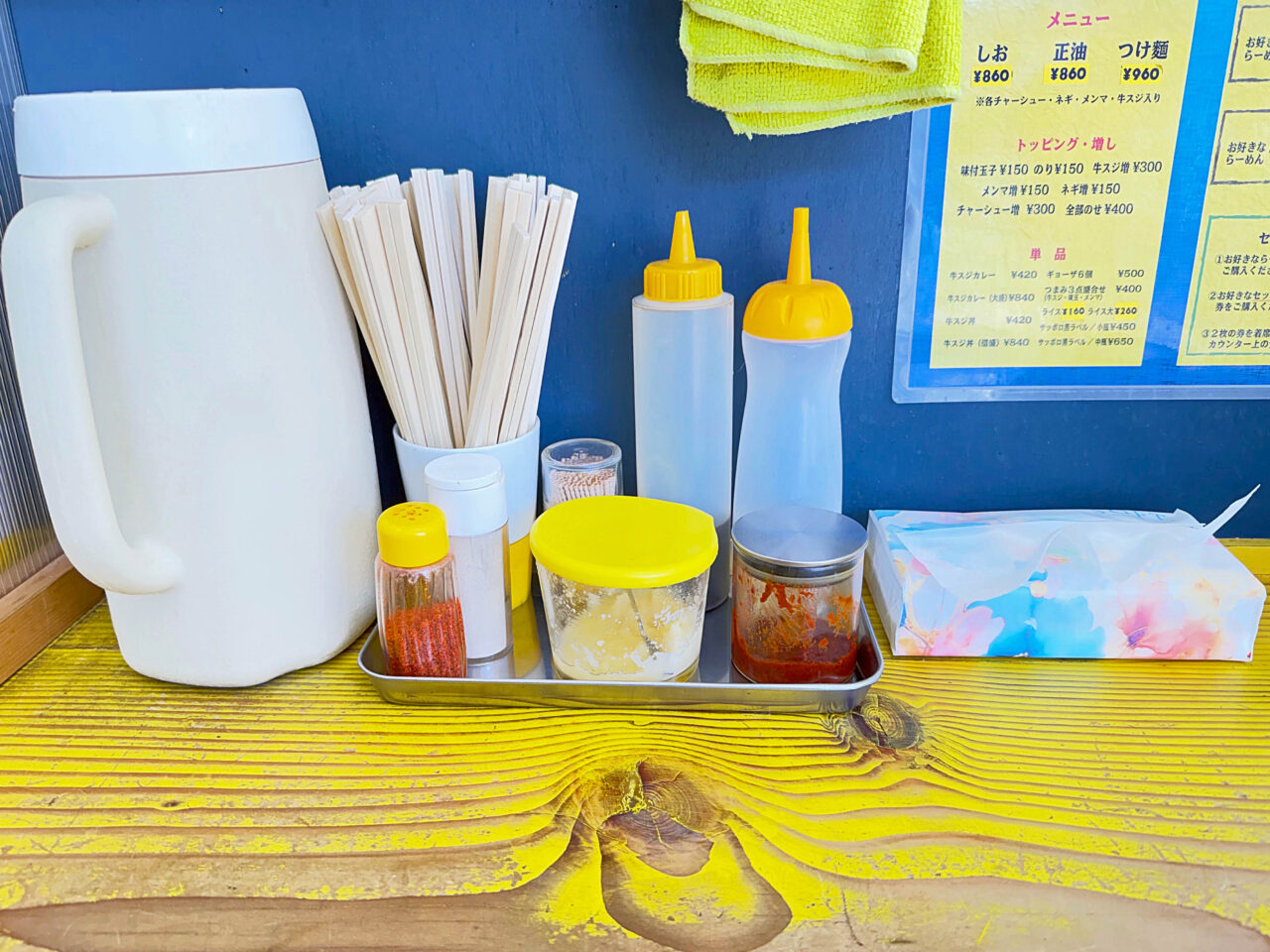 醤油とお酢は餃子用でしょうか。一味、胡椒、おろしニンニク、豆板醤と家系に近い調味料が載っています。