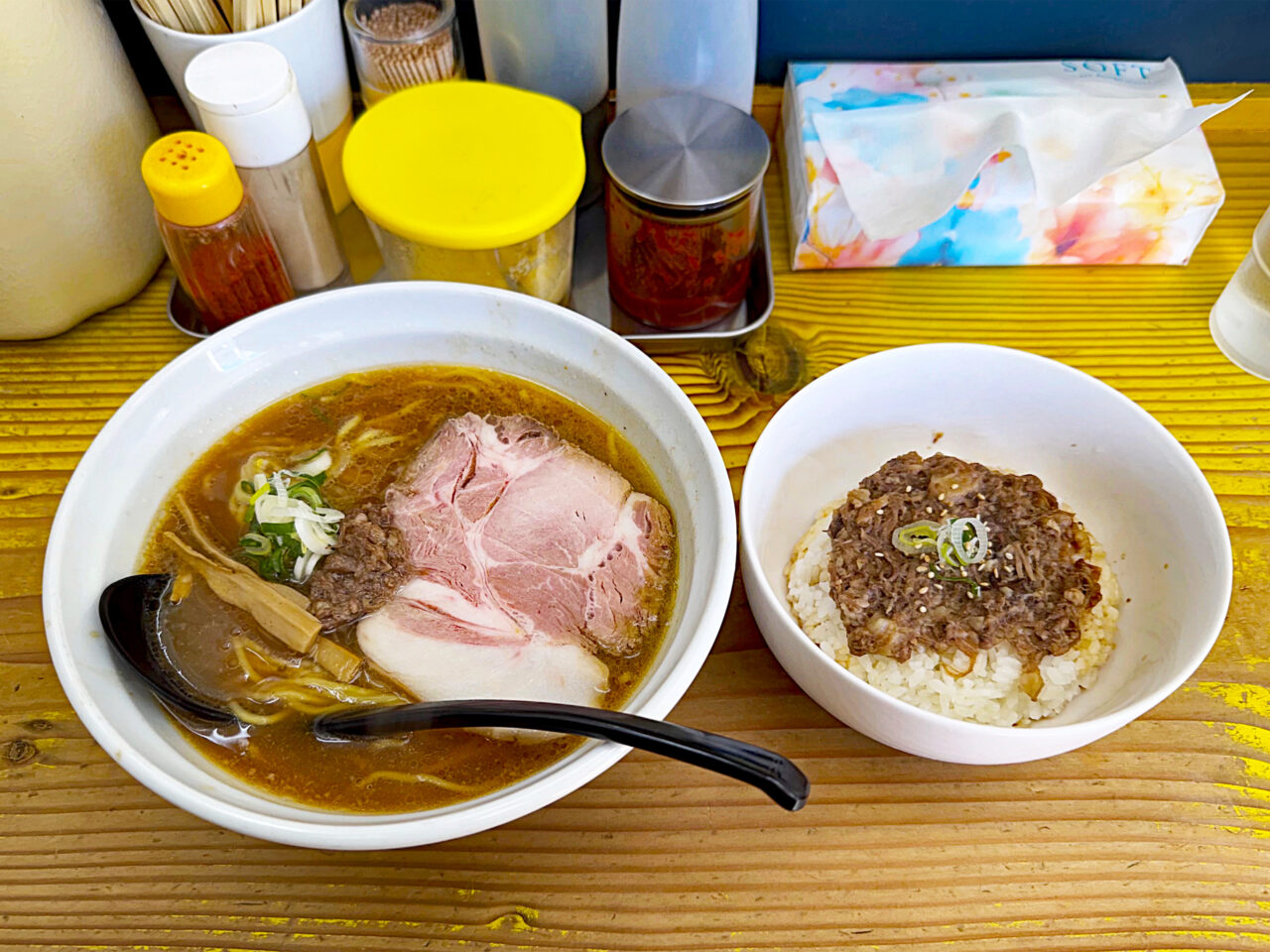 「らーめんほうき屋」さんの「正油らーめん」と「牛スジ丼」でしたが、とても美味しい組み合わせでした。