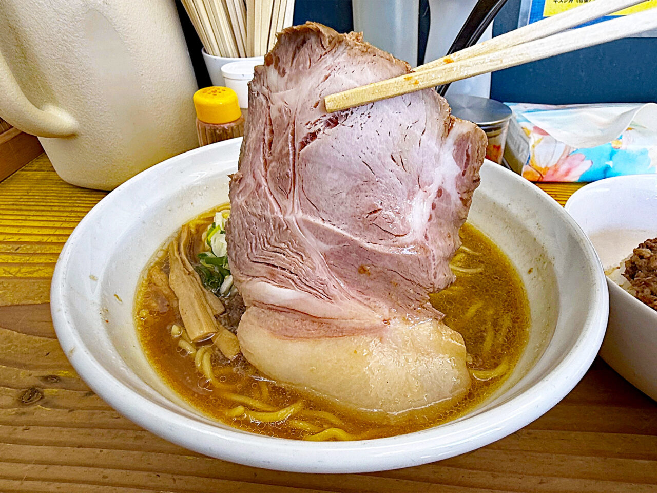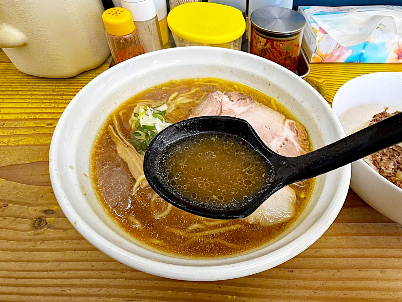 「正油ラーメン」と「牛スジカレー」の食券を出したら、店主さんから「正油らーめんと牛スジカレーのセットは味の相性が悪いですよ。牛スジ丼なら大丈夫です。」との事。