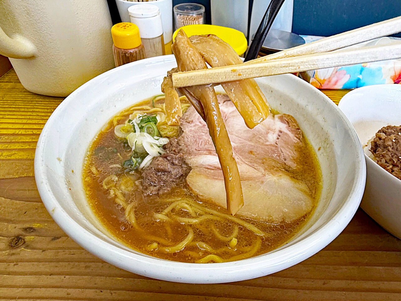 醤油味の牛骨スープにメンマがとても良く合います。